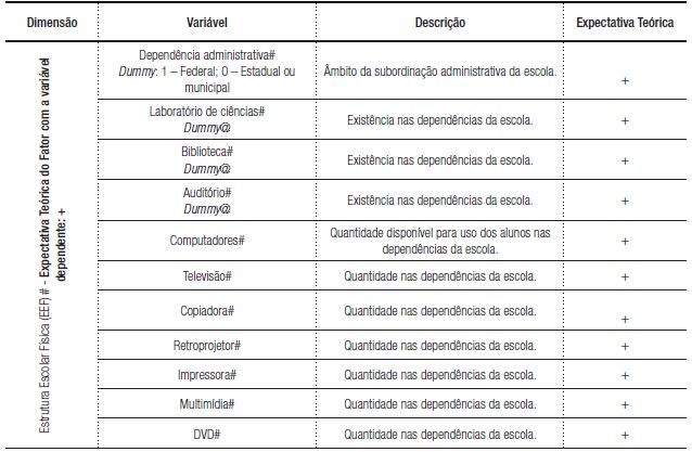Na operacionalização desta pesquisa as variáveis foram inseridas uma a uma no modelo, iniciando-se com a inclusão do fator estrutura escolar física. Assim, por meio da seleção Forward, o modelo foi ajustado, testando-se, gradualmente, a inclusão de cada variável independente, inserindo-se a variável que mais contribuía para a qualidade do modelo. Esse procedimento foi repetido até se atingir o máximo de significância possível para o modelo, obtendo-se maior precisão na análise. Houve também a verificação das correlações entre as variáveis, não se indicando a presença de multicolinearidade.
