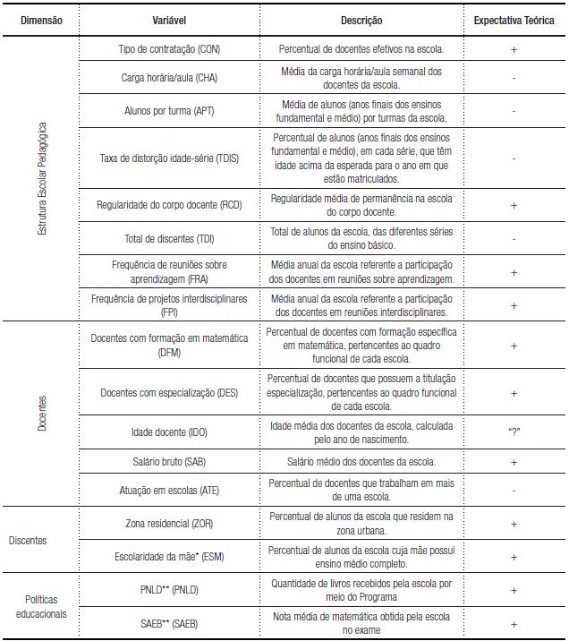 As dimensões das variáveis independentes da qualidade da educação foram compostas por fatores ou métricas individuais que possuem relações com o desempenho na OBMEP das escolas públicas. Para tanto, as dimensões foram divididas conforme a natureza das variáveis, a saber: “estrutura escolar física”, foram consideradas variáveis que correspondem ao espaço físico, bem como os equipamentos que compõem o ambiente escolar; “estrutura escolar pedagógica”, compreende as variáveis relacionadas à gestão pedagógica das escolas; “docentes”, foram inseridas as variáveis referentes ao perfil profissional e formação dos docentes; “discentes”, foi composta por variáveis relativas às características físicas e socioeconômicas dos discentes, e “políticas educacionais”, encontram-se as principais políticas públicas educacionais voltadas para o ensino básico. Sobre as dimensões apresentadas, é importante mencionar que as variáveis são representações do conceito plural da qualidade social da educação e se referem aos fatores tanto extraescolares quanto intraescolares ( Oliveira, J. F.; Santos, 2007). As escolhas das variáveis independentes, relacionadas à qualidade da educação, foram baseadas em revisão da literatura ( Abrucio; Franzese, 2007; Albernaz; Ferreira; Franco, 2002; Bastos et al., 2019 ; Bernardo; Almeida, 2019; Biasi, 2009; Dourado; Oliveira; Santos, 2007; Gadotti, 2010; Hanushek; Rivkin, 2006; Lacruz; Américo; Carniel, 2019; Oliveira, D., 2011; Silva, M., 2009), sendo apresentadas no Quadro 1.