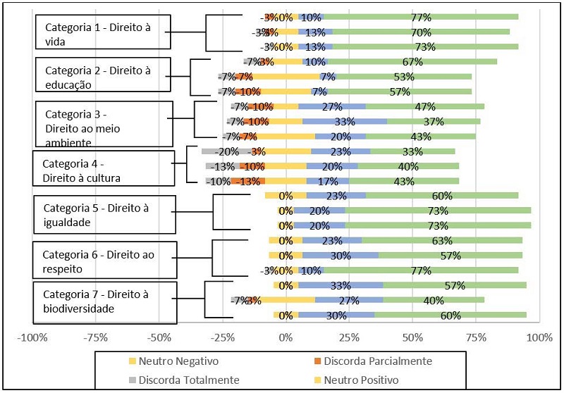 Com relação às categorias “direito ao meio ambiente” e “direito à biodiversidade”, verificam-se altos índices de discordância dos participantes quando indagados quanto aos direitos e deveres do ser humano sobre o meio ambiente, reflexões sobre os problemas ambientais, importância e cuidados sobre a biodiversidade e a influência desta sobre a existência humana. Destaca-se, por exemplo, que apenas 40% dos docentes concordam totalmente quando indagados se, em suas aulas, há discussão sobre as formas de cuidados e proteção com a biodiversidade do planeta.