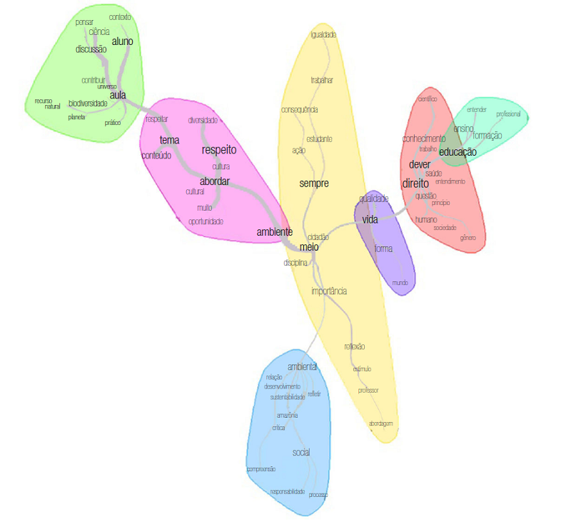 Verifica-se que, no grupo central da árvore de similitude, a palavra “meio” estabelece relações com as dimensões “social, educacional e ambiental”. Isso possibilita inferir que os docentes consideram diversas dimensões e fatores presentes no meio em que o discente se encontra e veem isso como algo que influencia sua formação e atuação profissional. Entende-se, portanto, que esse “meio” pode fazer parte do lugar onde a sustentabilidade se enraíza em bases ecológicas, em identidades culturais e em territórios de vida ( Leff, 2006), pois perpassa por todas as dimensões consideradas.