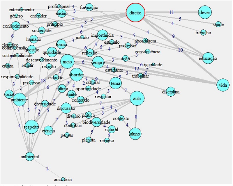 Na análise de especificidades, foi possível verificar as relações estabelecidas entre os termos usados nos discursos dos docentes em função das variáveis de caracterização desses termos, estabelecendo conexões específicas entre os discursos analisados. Assim, na representação gráfica formada a partir da AFC, no estilo teia de palavras ( Figura 3), verifica-se que a maior ênfase nos discursos proferidos pelos docentes recai na palavra “direito”, a qual aparece com maior representação do círculo, o que significa que foi emanada mais vezes. Além disso, o termo em questão estabelece várias conexões com outros destaques, como: vida, educação, saúde, trabalho, conhecimento, entre outros.