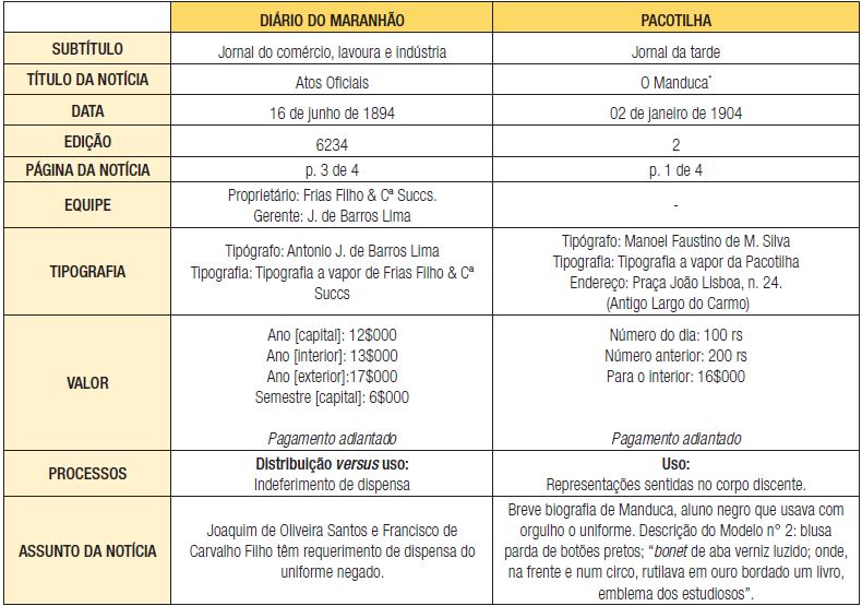 Na busca da forma do objeto, lidamos com duas vertentes: de um lado, entender o que são os jornais e onde estão localizadas as notícias sobre o uniforme; do outro, como são as descrições em registro. Para isso, apresentamos informações gerais sobre estes impressos e duas notícias publicadas (com diversos ritmos de periodicidade segundo sua importância, vigência e projeção) que tratam de condições distintas da sua imposição3: no Diário do Maranhão (1855-1911), uma negação ao uniforme; no Pacotilha (1880-1939), o orgulho da posse do modelo original. Essa oposição refere-se às práticas particulares de grupos ou indivíduos que vivenciaram o período da sua obrigatoriedade simultaneamente e correspondem ditas argumentações aos dois primeiros eixos de análise propostos.