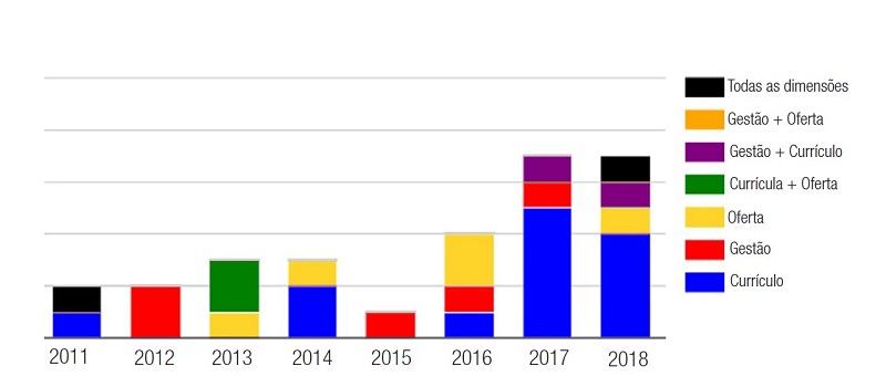 O Figura 1 ilustra a prevalência de ações desencadeadas pelo setor privado sobre os currículos escolares por meio da oferta ou venda de insumos curriculares, oferta ou venda de formação para docentes etc., seguida pela incidência na oferta educacional (pagamento de professores para aulas extras, oferta de atividades no contraturno etc.). Destaca-se que uma mesma iniciativa/programa pode incidir sobre mais de uma dimensão da política educacional.