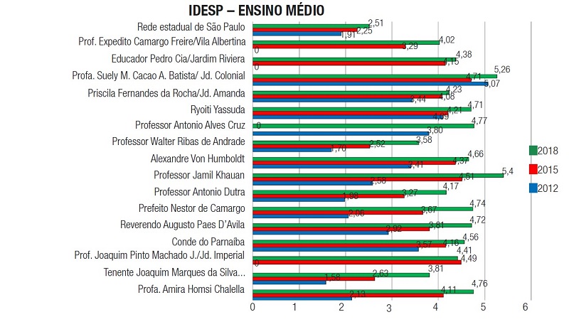 Portanto, as escolas que ingressaram no projeto piloto em 2012 eram, em sua maioria, unidades com Idesp já elevado. Em duas delas o índice ultrapassava 4 e 5 pontos, enquanto na rede estadual o Idesp médio do ensino médio era de 1,91. Nesse sentido, o programa favoreceu ainda mais as escolas que na sua origem já tinham bons resultados.
