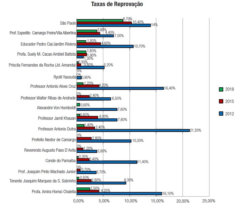 O Gráfico 3 mostra que a taxa de reprovação no conjunto de escolas era alta em 2012. Apesar disso, em apenas três era mais alta do que a média da rede estadual para o ensino médio. Cinco escolas alcançaram taxa zero de reprovação em 2018. A Escola Professora Suely Maria Cacao Ambiel Batista, que apresentou a segunda menor taxa de reprovação em 2012, aumentou de 1,3% para 1,8% em 2018. Com exceção dessa, todas as demais diminuíram o número de reprovações no período.