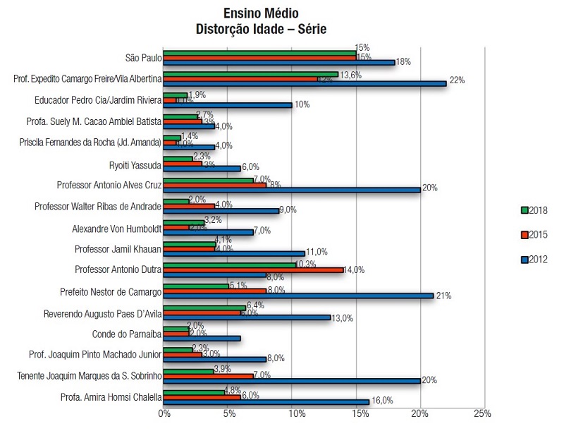As informações sobre o desempenho dos estudantes são compostas, para os fins desta análise, por: Idesp; taxas de reprovação; taxas de abandono; e distorção idade-série. O Gráfico 2 mostra que o Idesp aumentou nas dezesseis escolas no período, refletindo o crescimento observado no índice do ensino médio de todo o estado. Além disso, observa-se que, em 2012, catorze das dezesseis escolas PEI apresentaram índice acima da média estadual. Em 2015 e em 2018, o índice de todas ficou acima da média das escolas de ensino médio do estado, inclusive nas duas unidades que apresentaram Idesp abaixo da média em 2012: a Escola Professor Walter Ribas de Andrade, cujo Idesp em 2012 era de 1,70 e cresceu para 3,58 em 2018, e a Escola Tenente Joaquim Marques Silva Sobrinho, cujo Idesp passou de 1,58 para 3,81, enquanto o índice das escolas de ensino médio da rede estadual em 2018 passou de 1,91 para 2,51.