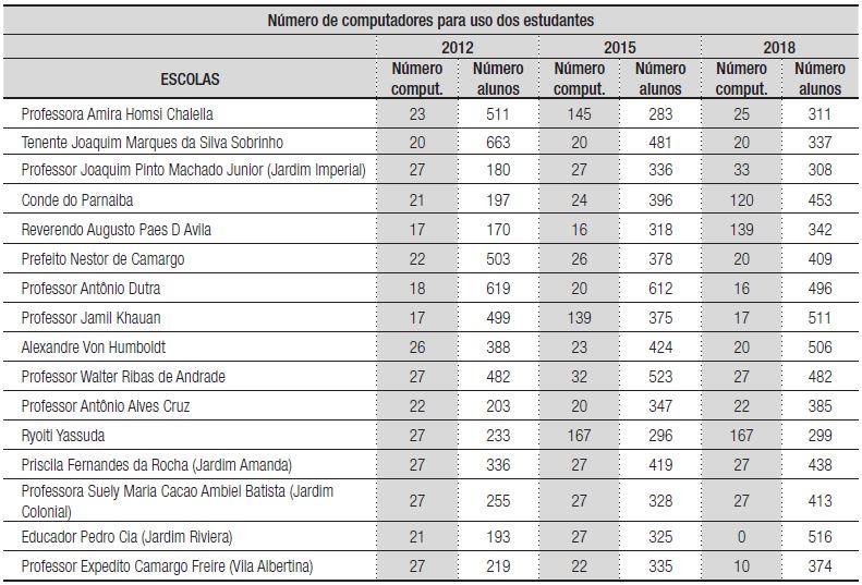 Apesar da existência de laboratórios de informática e internet banda larga em todas as escolas, observa-se na Tabela 2 que, de modo geral, não houve aumento significativo no número de computadores disponíveis para o uso dos estudantes na maioria, e em algumas delas, inclusive, diminuiu, como é o caso da Educador Pedro Cia e da Professor Expedito Camargo Freire. Em ambas o número de estudantes cresceu no período.