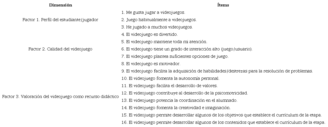 El proceso de recogida de información se realizó mediante el cuestionario sobre el uso de videojuegos en educación superior (Muñoz González et al., 2022), creado ad hoc y compuesto por una escala Likert 1-5 que va de totalmente en desacuerdo (1) a totalmente de acuerdo (5) en sus tres dimensiones: “Perfil del estudiante/jugador”, “Calidad del videojuego” y “Valoración del videojuego como recurso didáctico”. En total se abordan 16 ítems estructurados de la siguiente forma: