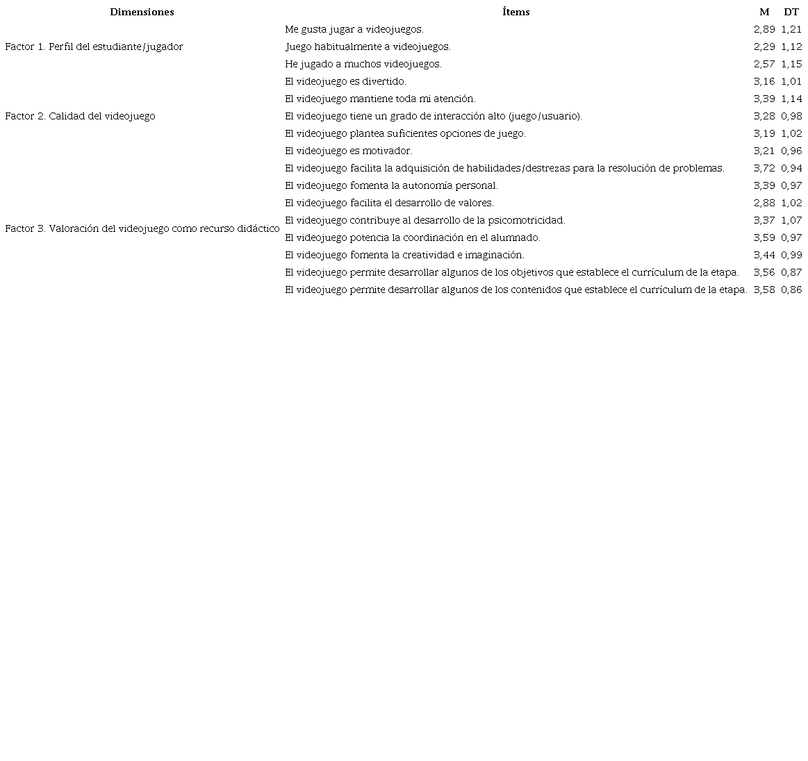 Estas dos dimensiones, junto a la última dimensión “valoración del videojuego como recurso didáctico”, presentaron un alto grado de interrelación entre ellas, aunque al final la dimensión “perfil estudiante/jugador” no resultó ser un factor predictivo de la dimensión “valoración del videojuego como recurso didáctico”.