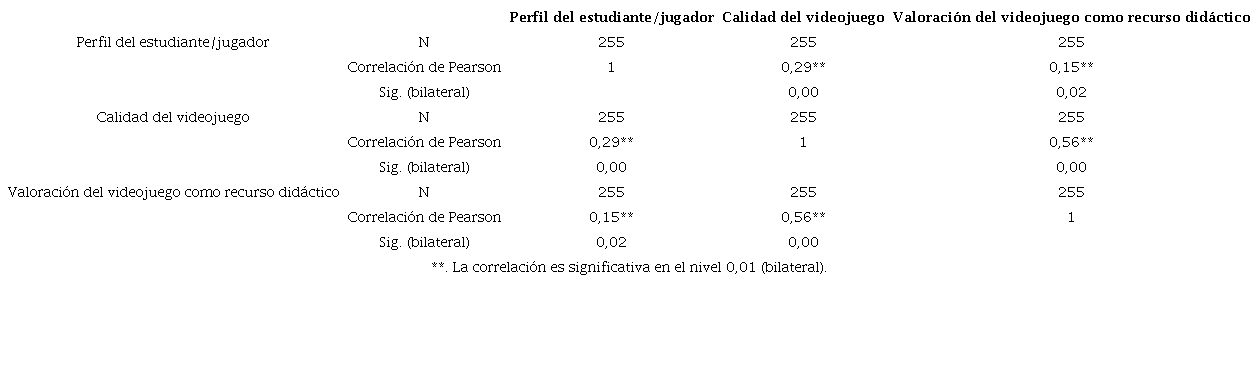 Los resultados muestran que existe una relación baja entre la dimensión 1 “perfil del estudiante/jugador” y la dimensión 2 “calidad del videojuego” y la dimensión 3 “valoración del videojuego como recurso didáctico” (R=0,29 y p=0,00; R=0,15 y p=0,02, respectivamente (Mateo, 2004; Pérez et al., 2009). Así mismo, la dimensión 2 “calidad del videojuego” y la dimensión 3 “valoración del videojuego como recurso didáctico” presentan una correlación moderada (R=0,56 y p=0,00).