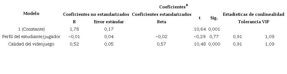 Los resultados alcanzados muestran que la dimensión “valoración del videojuego como recurso didáctico” es predicha por la dimensión “calidad del videojuego”, teniendo en cuenta estos resultados: β=0,52; t(52)=10,48, p<0,001. No obstante, la dimensión “perfil del estudiante/jugador” no resulta ser un factor predictor de la dimensión “valoración del videojuego como recurso didáctico” [β=-0,01; t(1)=-0,29, p>0,001]; por lo que se rechaza la hipótesis de relación lineal de las dos dimensiones con la dimensión “valoración del videojuego como recurso didáctico”.