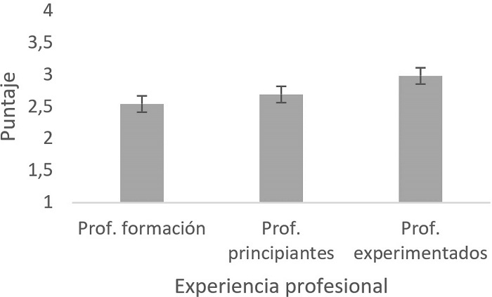 También se identificaron diferencias en la evaluación de la escritura según la experiencia profesional docente acumulada. En el indicador estructura textual el grupo de profesores en formación, independiente de la carrera de grado, asignó una puntuación más baja en comparación a las y los profesores con mayor experiencia docente. Al igual que en el caso del indicador de ortografía literal, en los resultados no se muestra una mayor o menor severidad por parte de este grupo de docentes, sino más bien, solo se da cuenta de las diferencias que se presentan en ambos grupos. En esta línea, estudios que han analizado los juicios evaluativos en función de la experiencia en otros contextos, exhiben resultados similares a los nuestros. Por ejemplo, un estudio sobre el arbitraje de artículos de investigación identificó que, los jueces novatos otorgaron puntuaciones más bajas que los jueces más experimentados (ver Astudillo et al., 2019). Por otro lado, resulta relevante que, aunque la estructura textual refleja un elemento discursivo relativamente estable, parece haber menos consenso sobre lo que se entiende como un nivel adecuado de este indicador, independiente del nivel de experiencia del profesorado.