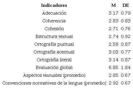 En términos generales, las y los profesores calificaron la escritura con un nivel adecuado (M = 2.89; DE = 0.83). El indicador con la puntuación media más baja fue ortografía puntual (M = 2.58; DE = 0.87). En contraste, los indicadores con las puntuaciones más altas fueron adecuación (M = 3.17; DE = 0.79) y ortografía literal (M = 3.14; DE = 0.87). En la evaluación global, el texto alcanzó una puntuación media de 6.85 (DE = 1.84). Al agrupar los indicadores relacionados con los aspectos textuales, el promedio fue de 2.85 (DE = 0.67), mientras que el promedio de los indicadores relativos a las convenciones de la lengua fue de 2.92 (DE = 0.67). Al analizar la relación entre ambos grupos de indicadores, se observó una relación positiva (r = 0.710; p < 0.001). Esto demuestra que las y los profesores que evaluaron de forma satisfactoria el producto escrito en los aspectos textuales también lo hicieron en los aspectos relacionados con las convenciones de la lengua. En la Tabla 2 se describe la media y la desviación estándar de cada indicador evaluado.