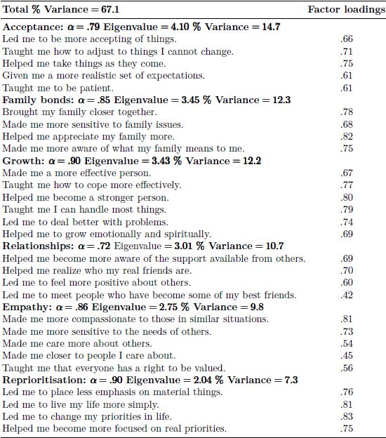 The psychometric properties performed well in this study with good levels of reliability and internal consistency shown and the criteria suggested by Lamping et al. (2002) were clearly met, similar to the original study. When testing for goodness of fit, it was found that allowing reprioritisation to correlate with acceptance and relationships improved the model substantially. This concurred with the original study where these factors were also allowed to correlate and, once again, the GBFS was found to be a good fit for the data when tested on this different, older sample.