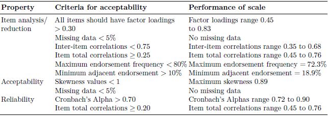 We used the set of criteria proposed by Lamping et al. (2002) and summarised by Smith et al. (2005) to set out some of the psychometric properties of the data (see Table 2). The data used in this study was based on a cross sectional survey so testretest reliability was not tested. However, the items and factors perform well on all the other dimensions as shown in Table 2.