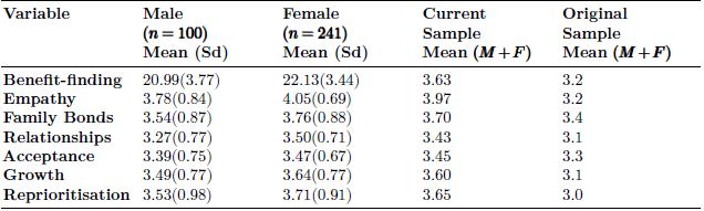 The next aim was to compare levels of benefit finding in the current sample with those in the original sample; one-sample t-tests were performed on benefit-finding in general, and on each of the individual variables within benefit-finding. Contrary to expectation, on all tests, the current sample scored significantly higher than the original sample (𝑝 = 0.001) - see Table 3 for details. Benefit finding in general, t(340) = 13.4, 𝑝 < .001, growth, t(340) = 11.9, 𝑝 < .001), reprioritisation, t(340) = 12.99, 𝑝 < .001, empathy, t(340) = 19.07, 𝑝 < .001, family bonds, t(340) = 6.19, 𝑝 < .001, acceptance, t(340) = 3.89, ?? < .001 and relationships, t(340) = 8.35, 𝑝 < .001.