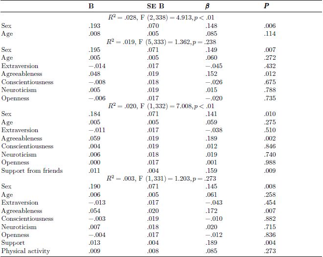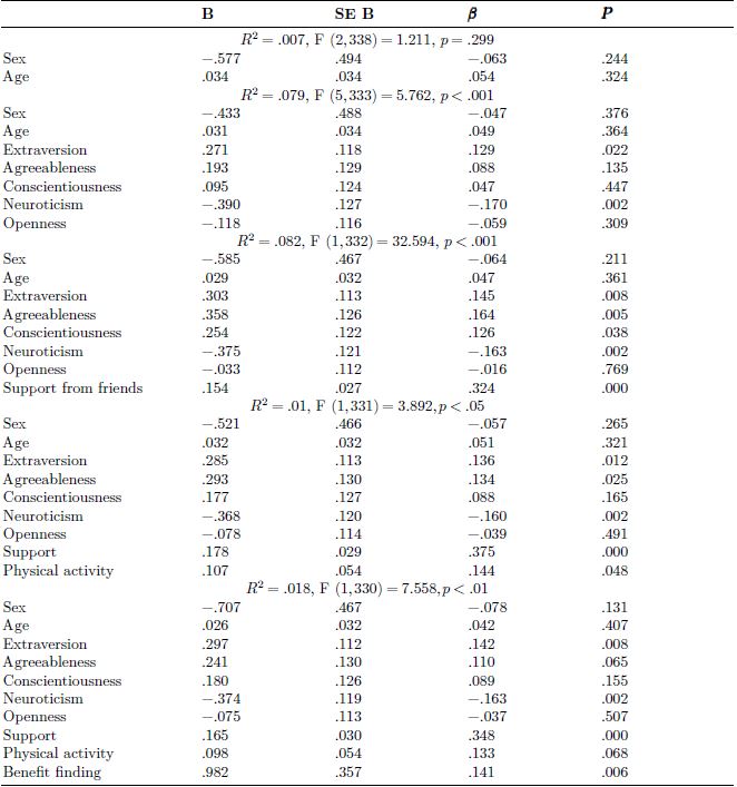 Next, two separate hierarchical multiple regression analyses (HMRA) were undertaken to explore partial correlations between the study variables. In the first analysis well-being was entered as the dependent variable (Table 4). On the first step age and sex were entered as predictor variables. On the second step the personality dimensions (extraversion, agreeableness, conscientiousness, neuroticism, and openness to experience) were entered. On the third step support was added and on the fourth step we entered physical activity. Finally, benefit finding was entered. Overall the model accounted for a small but significant percentage of variance in well-being (𝑅2 = .196, F (10, 330) = 8.047, 𝑝 < .001). The individual significant partial correlations were extraversion(𝛽 = .142, 𝑝 < .01, neuroticism (𝛽 = −.153, 𝑝 < .01), support from friends (𝛽 = .348, 𝑝 < .001), and benefit finding (𝛽 = .141, 𝑝 < .01).