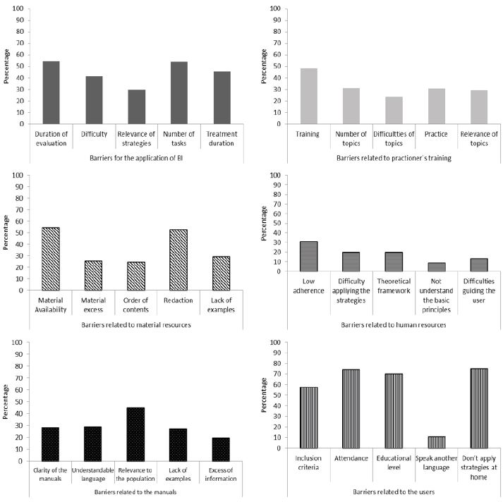 The main barriers related to materials point to the lack of materials and the difficulty of their contents, which proved to be a disadvantage for user comprehension. It is important to mention that therapists also report not applying the treatment completely as a barrier. Figure 1 shows the frequency of the barriers reported by the participants, by each type of barrier.