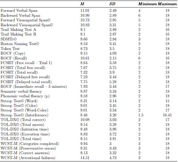 Table 2 shows the mean scores and standard deviations that reflect the performance in the Neuronorma.Co battery.