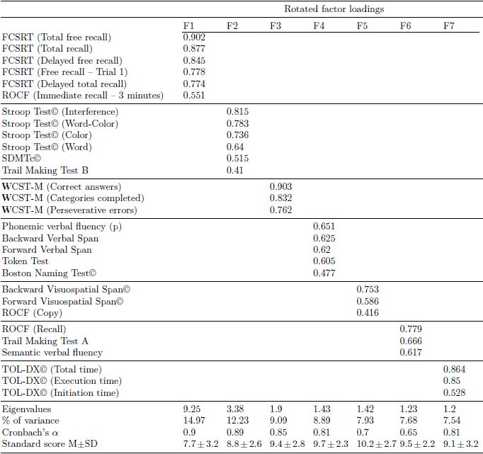 Seven factors with eigenvalues greater than 1 were extracted; their combination explained 68.36% of the variance (Table 3). The first factor groups tasks associated with memory functioning; the second factor displays the performance in tasks typically related to interference control or inhibitory control; the third component consists of variables that account for the performance in categorization and flexibility processes; the fourth factor groups tasks that show the performance in language; the fifth factor describes the performance in visuospatial planning; the sixth factor accounts for the processing speed; and, finally, the seventh component contains the processes required for planning (Tirapu-Ustárroz, Cordero-Andrés, Luna-Lario, & Hernáez-Goñi, 2017).