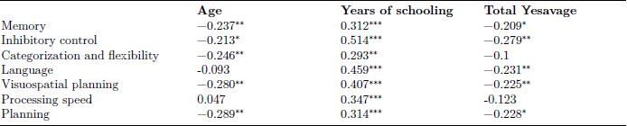 Results: Seven differentiated components of cognitive performance were identified. In the multivariate analysis, interference control and language were affected by the total score on the Yesavage Geriatric Depression Scale.