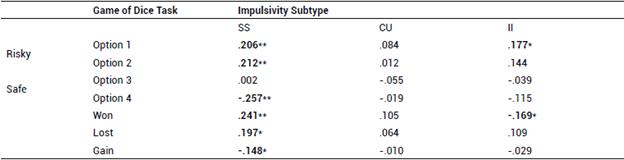 The association between the three proposed impulsivity factors and the different dependent variables was statistically evaluated through bivariate correlations. The Spearman's Rho statistic was used to find significant associations.