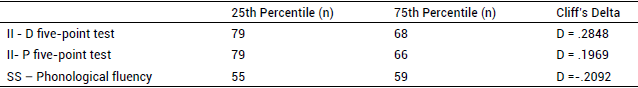 The SS model accounted for between 8.7% and 11.7% of the variance on the performance in phonological fluency, according to Cox Snell r2 and Nagerlkerke r2, respectively. In addition, the II facet accounted for between 8.9% and 11.9% of the variance on the number of designs made in the 5-point test, according to Cox Snell r2 and Nagerlkerke r2, respectively. Finally, II predicted between 5.2% and 7.3% of the variance on the performance of perseverative errors on the five-point test according to Cox Snell r2 and Nagerlkerke r2, respectively. When the effect size was analysed with Cliff's d, mean values were found (Appendix Table D).