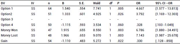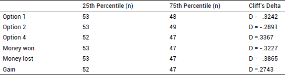 The model indicated that SS accounted for between 12.2% and 16.6% of the variance of the selection of option 1, according to Cox Snell r2 and Nagerlkerke r2, respectively. Regarding option 2, SS predicted between 9.6% and 13% of the variance according to Cox Snell r2 and Nagerlkerke r2, respectively. As to option 4, SS generated a trend that accounted for between 7.1% and 9.5% of the variance, according to Cox Snell r2 and Nagerlkerke r2, respectively. The logistic regression model also showed that SS accounted for between 18.4% and 24.5% of the variance on the money made, according to Cox Snell r2 and Nagerlkerke r2, respectively. The SS also predicted between 19.1% and 25.5% of the variance of money lost, according to Cox Snell r2 and Nagerlkerke r2, respectively. Regarding the final earnings, SS explained between 7.1% and 9.5% of the variance, according to Cox Snell r2 and Nagerlkerke r2, respectively. Finally, the selection of option 3 was not predicted by any of the variables. When the effect size was analysed with Cliff's d, mean values were found (Appendix Table A).