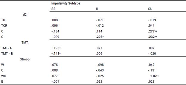 When the different tasks that measure attention and executive functioning were evaluated, the three aspects of impulsivity were found to show significant associations. The features of CU and II were associated with the types of errors in the d2 test. The higher the CU, the greater the number of omission and commission errors predicted, while the higher the II, only the greater number of commission errors were predicted. As for the Stroop test, the CU facet predicted an inverse relationship in performance in the Word-Colour (WC) sheet. Finally, higher scores on SS were associated with higher speed in the execution of both parts, A and B, of the TMT (Table 3).