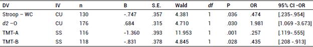 When the binary logistic regression models were applied, the CU facet was the only predictor of worse performance on two of the attentional variables evaluated. A higher CU predicted the increase in omission errors in the d2 and a lower ability to discriminate between items on the WC list of the Stroop test. In addition, SS was a positive predictor of shorter execution time for both parts, A and B, of the TMT test. The model discarded other features of impulsivity as well as the participant's age and years of schooling (Table 4).
