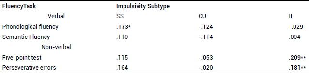 In the fluency tasks, the II facet was related to the nonverbal task of the 5-point test. The II scale predicted a greater number of designs but also a higher number of errors due to repetition. On the other hand, it indicated a positive association with a greater number of words uttered in the phonological fluency test. The CU facet showed no association with performance in the fluency tests (Table 5).