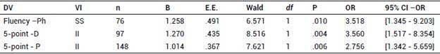 The analysis based on the Mann-Whitney U test indicated a significant tendency in individuals scoring high on SS towards a greater number of words in the phonological fluency task (Z = -1.931, p =.053) than those who scored low on this facet. On the other hand, participants scoring high on II both made significantly more designs in the five-point test than low scorers (Z = -2.976, p =.003), and also performed a greater number of repetitions in the designs (perseverance) (Z = -2.747, p =.006). When binary logistic regression models were applied to the performance in the d2 and 5-point tests, significant predictions of II were found (Table 6).