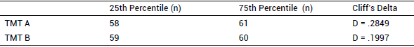 Furthermore, SS accounted for between 10.3% and 13.8% of the variance in the speed of execution of the TMT, part A, and between 4.1% and 5.5% of the variance in time of execution for part B. When the effect size was analysed with Cliff's d, median's values were to be found (Appendix Table C).