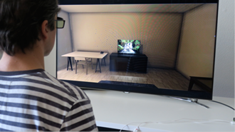 After ethical approval by the Ethics and Deontology Committee for Scientific Research (CEDIC), participants were recruited as part of a Cyberpsychology Course experimental demonstration. Each student invited to participate had the option do decline their participation at any stage of the experiment, since the participation was not mandatory or involved in the course grading. After reading and given their written consent, each participant would then complete the first part of the self-report measures. Once concluded, they were directed to a room with a 3D-TV setup (Samsung active 3D 46-inch SmartTV Plasma TV, Model UE46F800) of the virtual room environment and start being monitored for their HR, as seen in Figure 4.