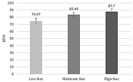 In regards to HR at different moments of the 3D-TV exposure between different groups of fear of cockroaches, results have shown only a main effect of fear group [Wald χ2(2) = 6.02, p = .049], showing that high fear group had more pronounced HR activity than the low fear group. However, no other significant differences were found between fear groups (see Figure 4). Neither a main effect of moment [Wald χ2(3) = 3.90, p = .273], nor an interaction effect [Wald χ2(6) = 11.20, p = .082] on HR were found.