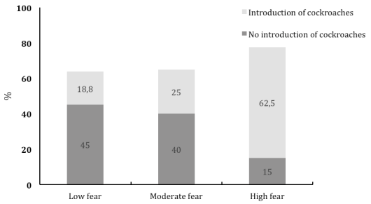 As concerned to introduction of cockroaches into the VR scenario due to HR, chi-square results showed a significant relationship between the introduction of cock-roaches and the fear group χ2(2) = 6.98, p = .031 (Figure 5). A more detailed analysis indicated that the high fear group had a higher percentage of cases with introduction of cockroaches into the scenario (Zadj = 2.6) than in the low fear group (Zadj = −1.7) and moderate fear group (Zadj = −.9).