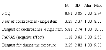 For the purpose of this study, the following self-report measures included: (1) a socio-demographic questionnaire; (2) the Fear of Cockroaches Questionnaire (FCQ); (3) the Differential Emotions Scale (Izard, 1977); and (4) the Positive and Negative Affect Schedule (Watson et al., 1988).