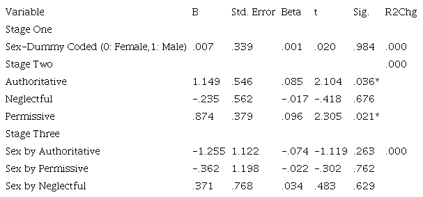 Formal, planned data analyses of the hypotheses were conducted using hierarchical multiple regression analyses. These hierarchical multiple regression analyses explored the possible interactive effect of parenting styles with sex on levels of depression and anxiety. At the first stage of the regression analysis, sex was entered into regression equation as dummy coded variable with females serving as the reference groups. At the second stage of analysis, the three variables representing parenting styles were entered into regression equation as dummy coded variables with authoritative parenting serving as the reference group. At the third stage of analysis, three separate variables representing the interaction of sex by parenting styles were entered into the regression equation. For all regression analyses, depression and anxiety served as the dependent variables, while sex, the three dummy coded variables representing type of parenting, and the three separate terms representing the interactions of sex by type of parenting, served as the independent variables.