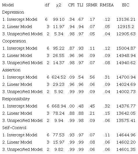 Three unconditional models (intercept only; intercept and linear slope; intercept and unspecified slope) were fit for the univariate growth models of depression, cooperation, assertion, responsibility, and self-control, respectively. The intercept model provided a poor fit to the depression data, χ2(6) = 99.10, p <.01, CFI=.34, TLI=.67, RMSEA=.12, SRMR=.17, indicating that some form of growth occurred from 5th grade to 9th grade. The linear slope model provided an acceptable model fit, χ2(3) = 11.97, p <.01, CFI=.94, TLI=.94; RMSEA=.05, SRMR=.07. To identify the unspecified slope model, we fixed the Time 1 (5th grade) slope/shape to 0 and the Time 3 (9th grade) slope/shape factor loading to 10.5, based on the maximum likelihood estimate from the initial unspecified model. Time 2 (6th grade) slope/shape factor loading was freely estimated. The unspecified slope model also provided a reasonable model fit, χ2(2) = 5.4, p = .07, CFI=.98, TLI=.97, RMSEA=.04, SRMR=.05. The BIC of unspecified model (12905.63) is smaller than the BIC of linear model (12915.32), suggesting that a curvilineargrowth trajectory is better than a linear growth trajectory to represent the intra-individual depression change from 5th grade to 9th grade. The slope/shape loadings are 0, 1.003, 10.5 for 5th grade, 6th grade, and 9th grade. The 6th grade loading (1.003) did not depart significantly from 0 (p = .09), indicating that the level of depression remained relatively constant from 5th grade to 6th grade. The intercept factor mean of depression revealed significant level of depression in 5th grade (µ = 1.30, p < .001), and the estimate of the slope factor was significantly positive (µ = .07, p < .001). The variance of intercept factor (σ2 = 2.09, p < .001) and the variance of slope/shape (σ2 = .04, p < .001) factor were significantly different from zero, showing that there were individual differences in depression at the initial status (5th grade) and at the rate of change from 5th grade to 9th grade. The factor covariance between intercept and slope/shape was significant (σ2 = .06, p = .01), indicating that adolescents who had a lower depression in 5th grade increased faster in depression through 9th grade, which reflects the phenomenon of regression to the mean.