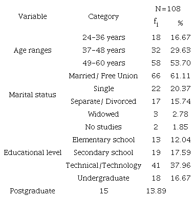The sample consisted of 108 women with a mean age of 47.2 years, being the most frequent age range in the sample corresponding to the interval 49-60, with 53.7%. Approximately 60% had a stable relationship and 68.52% of the sample had developed higher level studies, including technical or technological training and university education at undergraduate and graduate levels. Only 1.85% of the participants reported not having completed formal studies, although they had an adequate level of reading comprehension to allow the application of psychometric instruments. The socio-demographic details of the sample are summarized in Table 1.