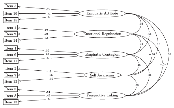 Contagio emocional: ítems 1-6-11 Autoconciencia: ítems 2-7-12 Toma de perspectiva: ítems 3-8-13 Control emocional: ítems 4-9-14 Actitud empática: ítems 5-10-15