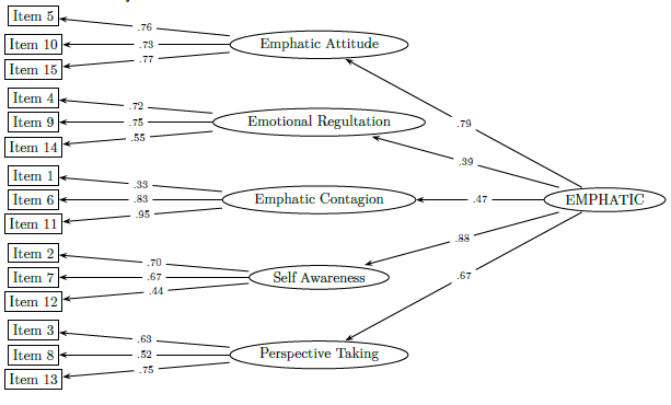 Regarding the internal validity of the sample, we have proven a structure of five factors, according to the theoretical model we started from, through a confirmatory factorial analysis which fit indexes were highly satisfactory. At the same time, the weighing of the items in each factor was significant in all cases. In addition, we carried out a CFA of second order, which fitting would indicate the possibility of summarizing the scores obtained from the five dimensions in just one, referred to empathy in general, although it would be a little lower than the multidimensional model.