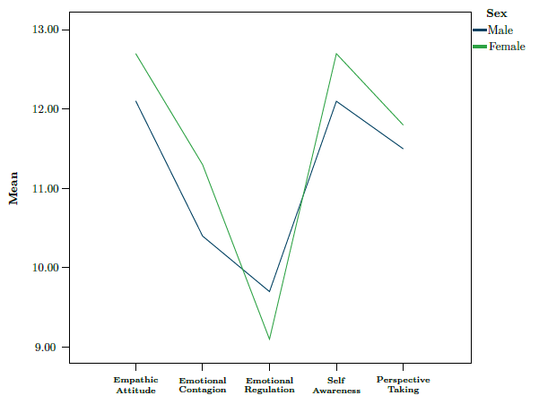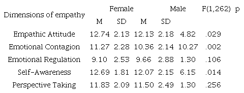 Regarding the analysis of differences between the empathy of men and women, the results indicated that the empathy profile differs according to the gender - HotellingsF (5, 258) = 3.85; p < .002; η2=.07-. The dimensions in which significant differences were specifically observed were empathic attitude (F (1, 262)=4.82; p <.000; η2=.02), emotional contagion (F (1, 262)=10.27; p < .002; η2=.04), and self-awareness (F (1, 262)=6.15; p < .014; η2=.02). In the three dimensions, women obtained higher scores (see Table 4 and Figure 3).