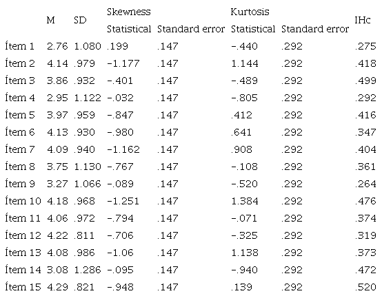 In Table 1, the descriptive statistics are presented for each item. As can be observed, the asymmetry and kurtosis scores did not outweigh figures +/2 whatsoever, as recommended by some authors (Bandalos & Finney, 2010; Muthén & Kaplan, 1985). Regarding the capacity of discrimination, assessed from the corrected homogeneity index (HI), most items showed values >.30 (Kline, 1999; Martínez Arias, 2005), except items 1, 4, and 9, with values >.25, which, although somehow lower, would be within acceptable values (Muñiz, 1993, 1998; Muñiz et al., 2005).