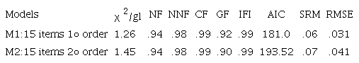In Table 2 one can observe the values corresponding to the evaluated fit indexes: χ2/gl, NFI, NNFI, IFI, CFI, AIC and RMSEA of each model. Results indicate an adequate fit of both models. In Figures 1 and 2, the models of first and second order are graphed, indicating standardized saturations.