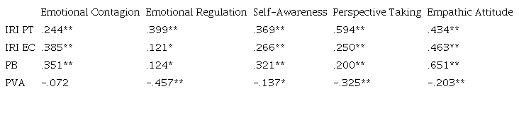 When evaluating the correlation between the different dimensions of empathy that the instrument under study operationalizes, and the dimensions perspectivetaking and empathic concern from the IRI (Davis, 1983), results indicated, as can be observed in Table 3, a positive and significant correlation between all the dimensions, which supports an adequate convergent validity.