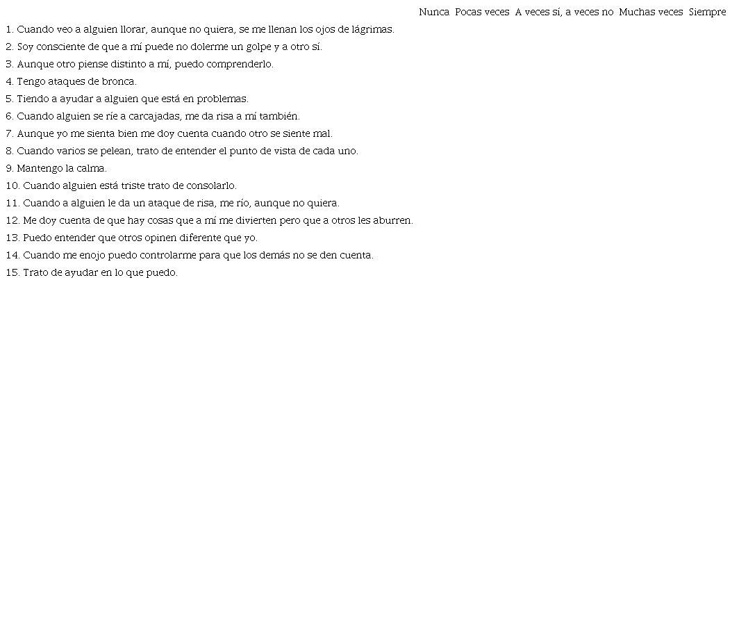 Por favor, hacé una cruz X en la opción que muestre mejor lo que a vos te pasa. Hacé sólo una cruz para cada afirmación. No hay respuestas correctas o equivocadas. Gracias por contestar a todos los ítems.