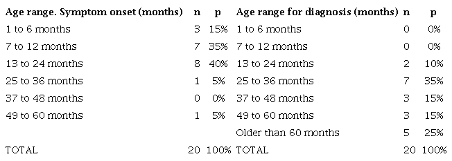 20 patients were included with an age media of 10.5 years, SD 5.48 years. The male to female ratio was 8.5:1.5. The onset age of autistic symptoms, such as social impairment, limited initiation of social interaction and abnormal responses to social overtures, and deficit in verbal and nonverbal social skills, was between 4 and 60 months, with a media of 17.6 months, SD 12.5 months. The median age for the diagnosis of ASD was 53 months, SD 28 m. Table 1.