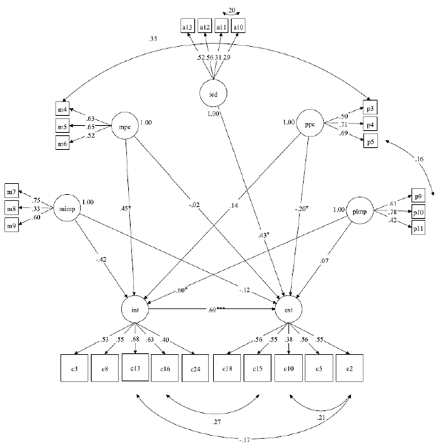 Structural coefficients indicate that paternal imposition is a fair predictor of internalizing problems (β =.6, p = .01). As to psychological control, maternal practices are predictors of internalizing problems (β = .45, p =.009) and surprisingly, paternal practices of psychological control had a negative effect on the development of externalizing problems (β = .2, p = .04). As expected, inconsistent discipline acted solely upon externalizing problems (β = .42, p = .003) and is considered a moderate predictor. Internalizing problems were significant and robust predictors of externalizing problems (β = .69, p < .000) (see Figure 1).
