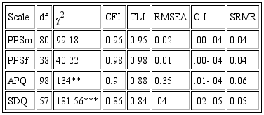 The Exploratory Factor Analysis on the APQ extracted three dimensions with 57% of explained variance. Inconsistent discipline was measured through items 10-13 (same items as the reported scale) and presented adequate internal reliability (α = .64). Regarding problem behaviors, the EFA extracted 3 factors with 61% of explained variance: Internalizing Problems were measured through items, 2, 5, 10, 15, and 18; Externalizing Problem Behaviors items 3, 8, 13, 16, and 24. Both subscales presented adequate internal reliabilities (α = .69 and α = .67, respectively). Resulting modifications of the questionnaires rendered adequate fit statistics for both instruments: APQ: S-B χ2(95) : 114.41(p > .05), CFI: .94, TLI: .93, RMSEA: .02. SDQ: S-B χ2(40) : 38.78(p > .05), CFI: 1, TLI: 1, RMSEA: .0.